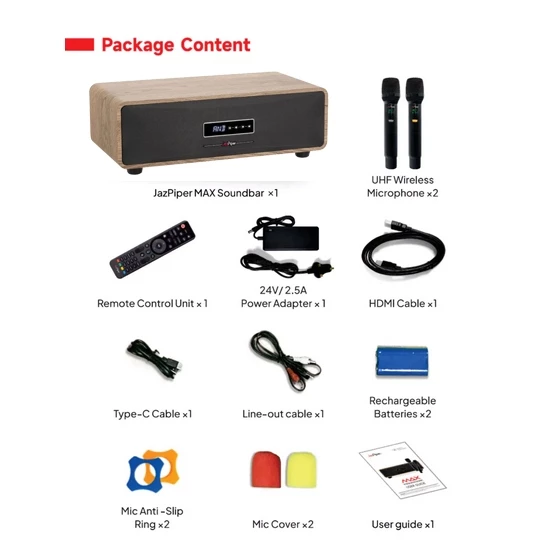 • Package Includes: Main Console, 2 Wireless Microphones, Power Adapter, Remote Control, HDMI Cable, User Manual